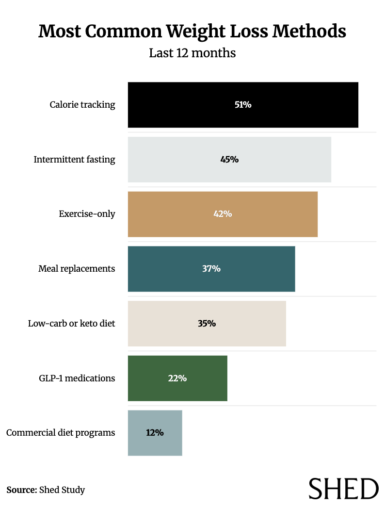 Not all Americans are abandoning tried-and-true methods for weight loss. A majority still rely on familiar strategies like calorie tracking (51%), intermittent fasting (45%), and exercise-only approaches (42%). Other common tactics include meal replacements (37%) and low-carb or keto diets (25%).