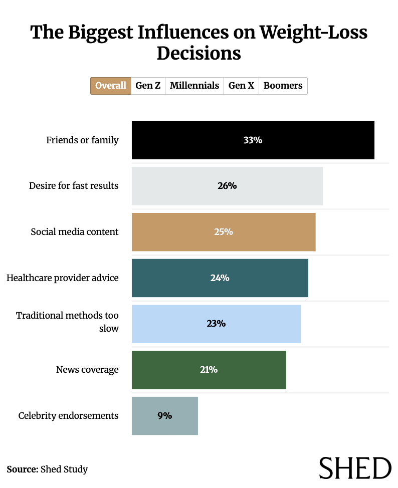 Friends and family are the top influence overall (33%), followed by a desire for fast results (26%) and social media (25%). About one in four (24%) say medical advice from a healthcare provider guided their approach, while roughly one in five point to difficulty with traditional methods (23%) or news coverage (21%). Celebrity endorsements rank last at just 9%, showing that personal networks and everyday motivations carry far more weight than star power.