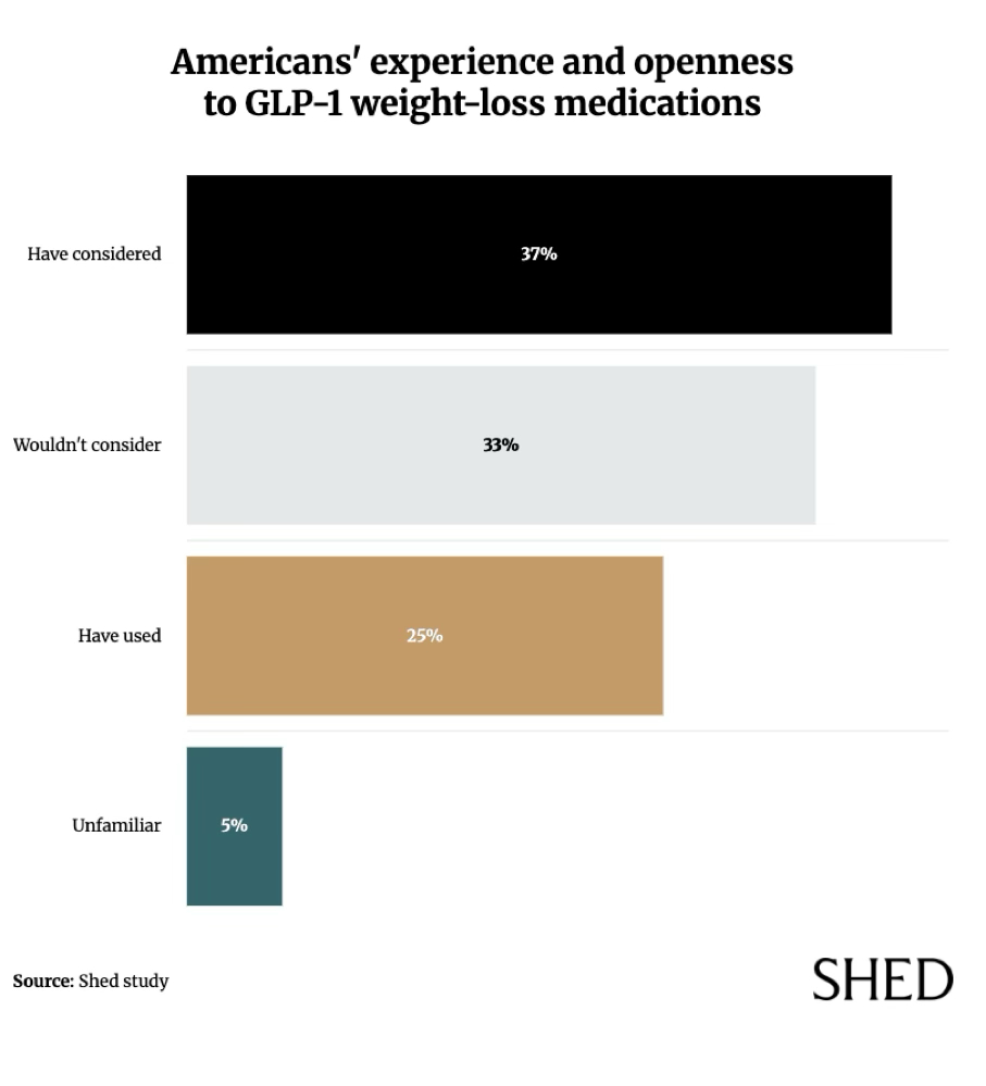 Prescription weight-loss drugs have dominated the cultural conversation for a few years now, but adoption remains uneven. Nationally, 25% of adults have used a GLP-1 medication, 37% have considered it, and 33% wouldn’t consider it, while 5% remain unfamiliar. Some are embracing a future with GLP-1s, while others are skeptical—or even distrustful.